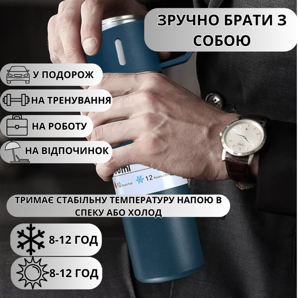 Подарунковий набір: вакуумний термос 500 мл з нержавіючої сталі з 3 чашками, синій Цей елегантний і функціональний набір стане незамінним аксесуаром у подорожах, на роботі чи навчанні. Він поєднує в собі стиль, зручність та надійність, дозволяючи насолоджуватися улюбленими напоями будь-де. Комплектація та особливості: Термос об“ємом 500 мл – виготовлений із високоякісної нержавіючої сталі 304, безпечної для здоров“я та без впливу на смак напоїв. Три зручні чашки – одна з них виконує роль кришки термоса, а дві інші ідеально підходять для комфортного чаювання в дорозі. Герметична конструкція – надійний клапан запобігає протіканню та забезпечує зручне відкриття одним рухом. Протиковзке покриття – забезпечує комфортне використання та запобігає вислизанню з рук. Стильний синій колір – універсальне рішення, що пасує як чоловікам, так і жінкам. Компактні розміри (235×65 мм) – легко поміщається в сумку, рюкзак або підсклянник в автомобілі. Переваги: Зберігає температуру напоїв до 12 годин, залишаючи їх гарячими або холодними. Виготовлений з безпечних та довговічних матеріалів, без токсинів і сторонніх запахів. Ергономічний дизайн – поєднання стильного вигляду та практичності. Міцний корпус – внутрішня частина виконана з нержавіючої сталі, а зовнішня – з якісного пластику.