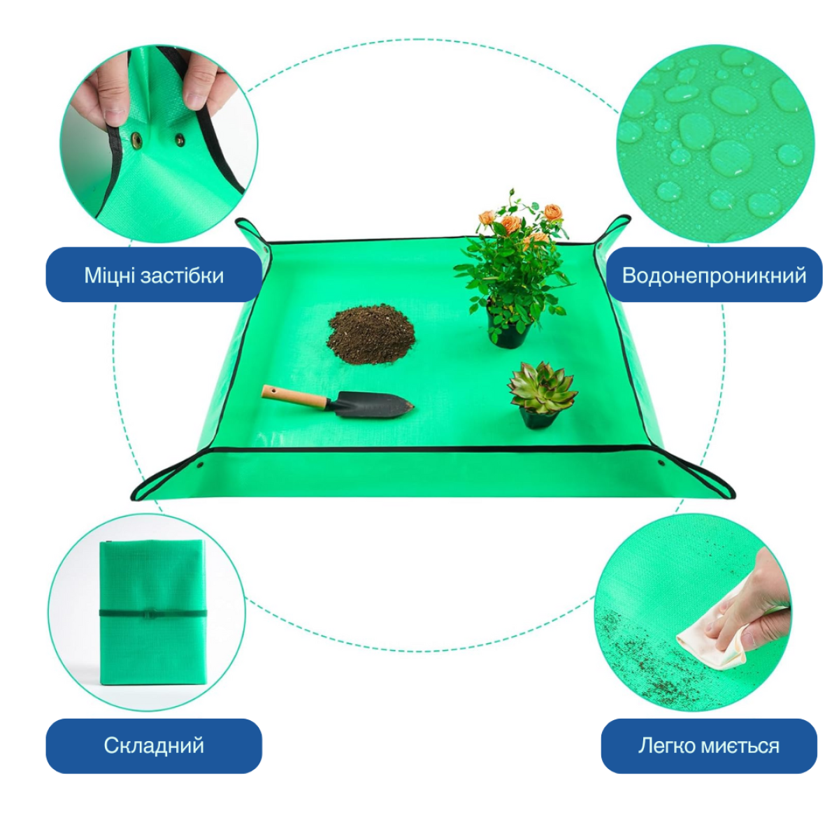Забудьте про безлад при пересадці рослин! Портативний садовий килимок 50×50см надійно захистить вашу робочу поверхню від бруду і вологи, підтримуючи чистоту вдома, на балконі або в саду. Водонепроникний матеріал запобігає протіканню води, а зручні засувки фіксують краї, утворюючи практичний піддон. Проста система фіксації з кнопками перетворює килимок на зручний піддон, запобігаючи розсипанню ґрунту та витоку води. Підходить для роботи на балконі, кухні, в саду або теплиці. Після використання легко очищається і складається, займаючи мінімум місця при зберіганні. Ідеальний аксесуар для садівників і любителів кімнатних рослин. Характеристики: Тип: килимок садовий складний, з кнопками Розмір: 50×50 см Матеріал: водонепроникний ПВХ Застосування: пересадка, зміна ґрунту, полив, обрізка рослин Колір: помаранчевий