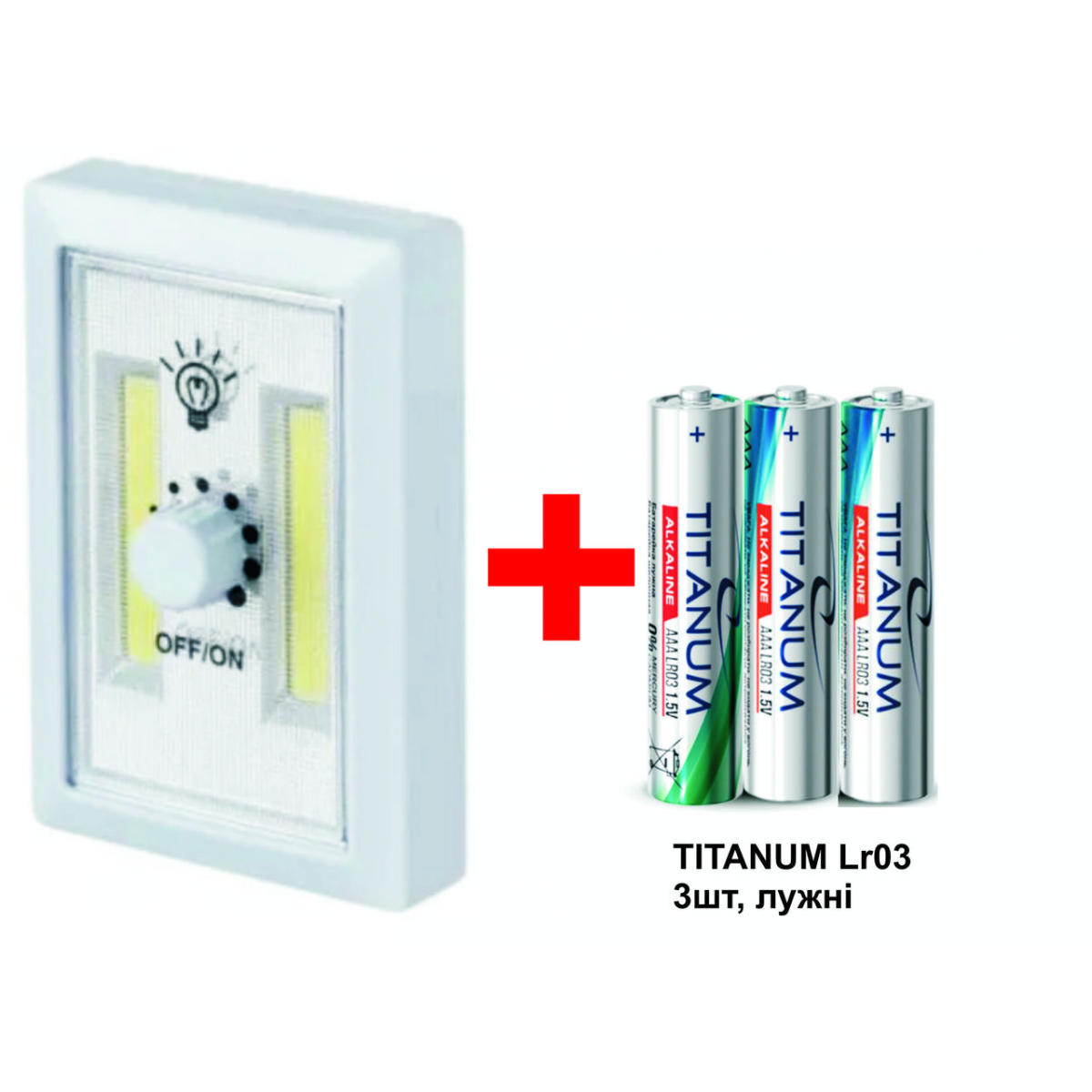 Ліхтар-кнопка COB Switch Light, плавне регулювання + батарейки Videx LR03, лужні, 3 шт., комплект