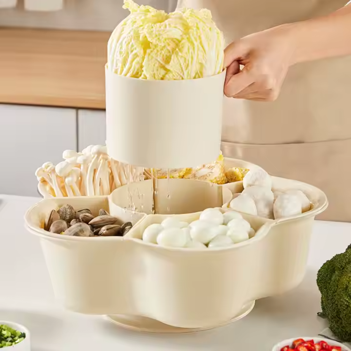 Контейнер для миття овочів, таця з обертанням, для подачі їжі, органайзер із 6 відділеннями, прозоро-бежевий