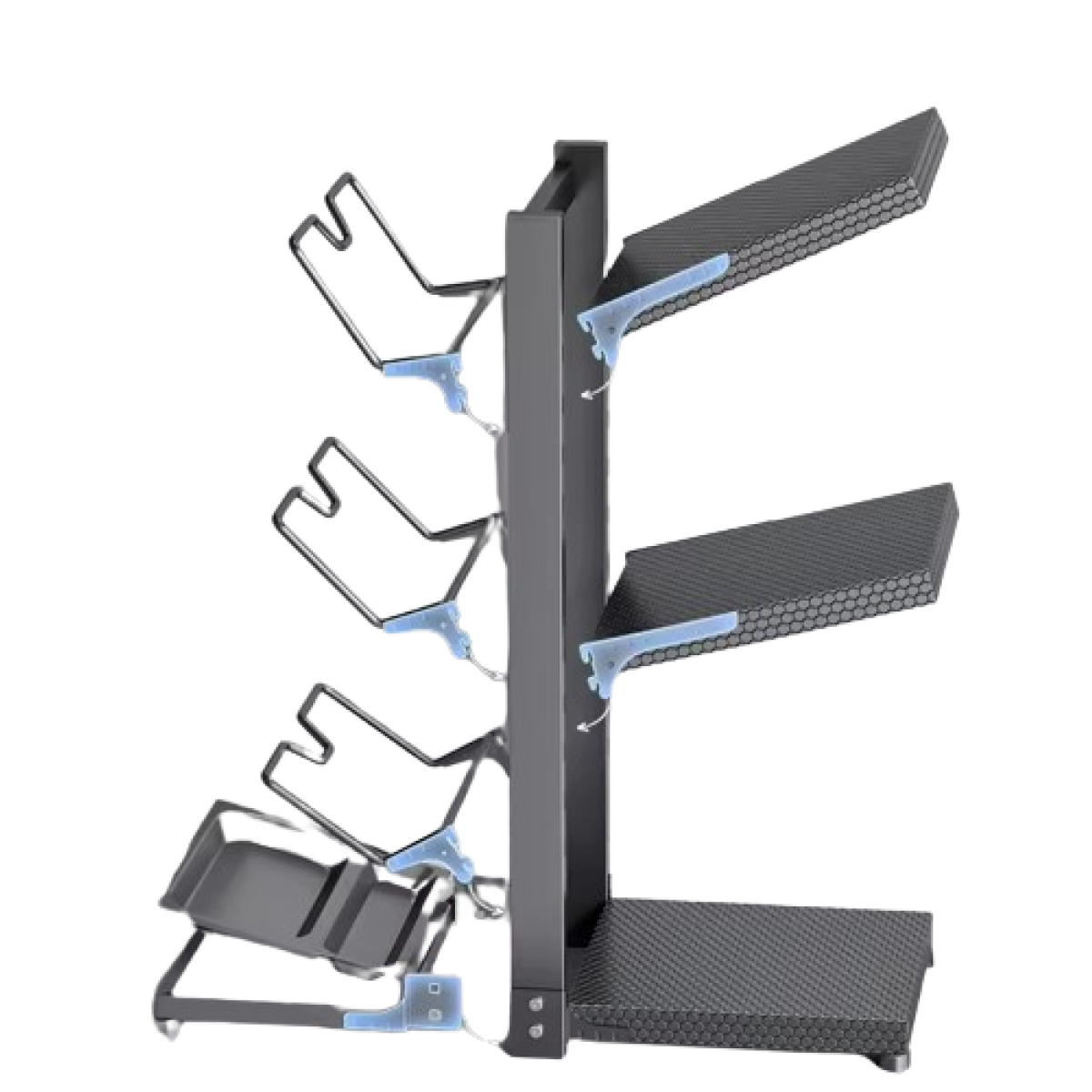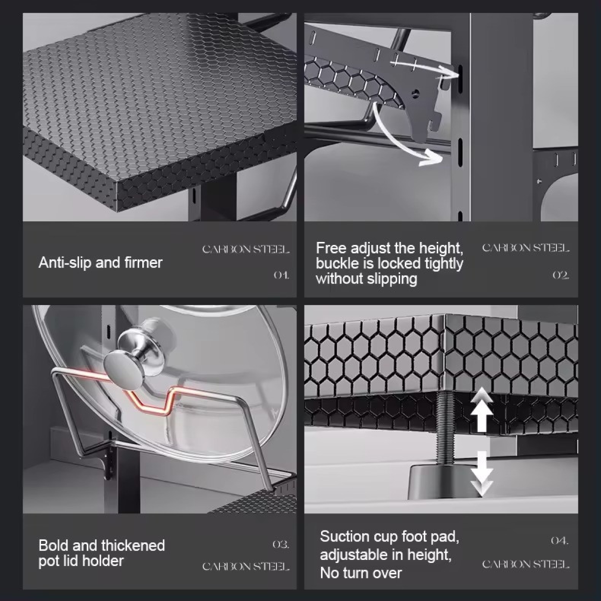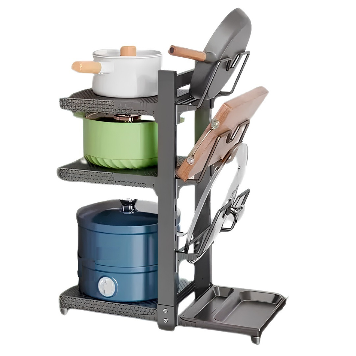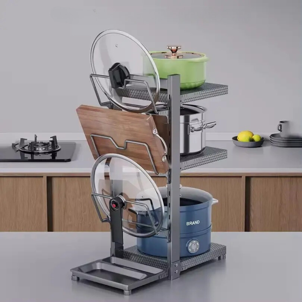 Полиця-підставка для каструль на 3 полиці двостороння з 3 тримачами для кришок з вуглецевої сталі, сіра