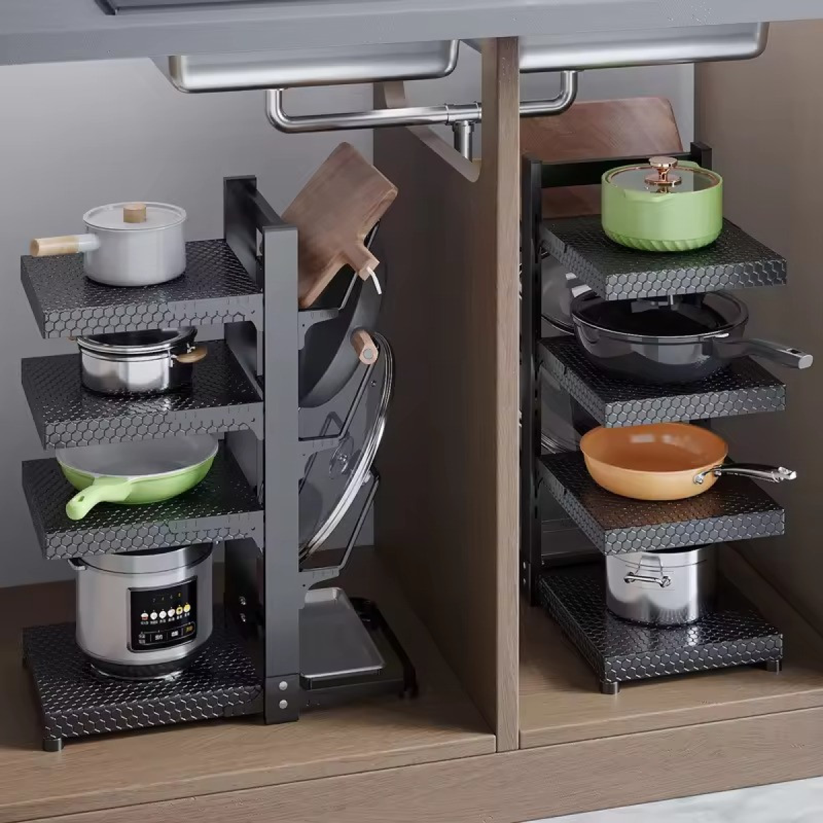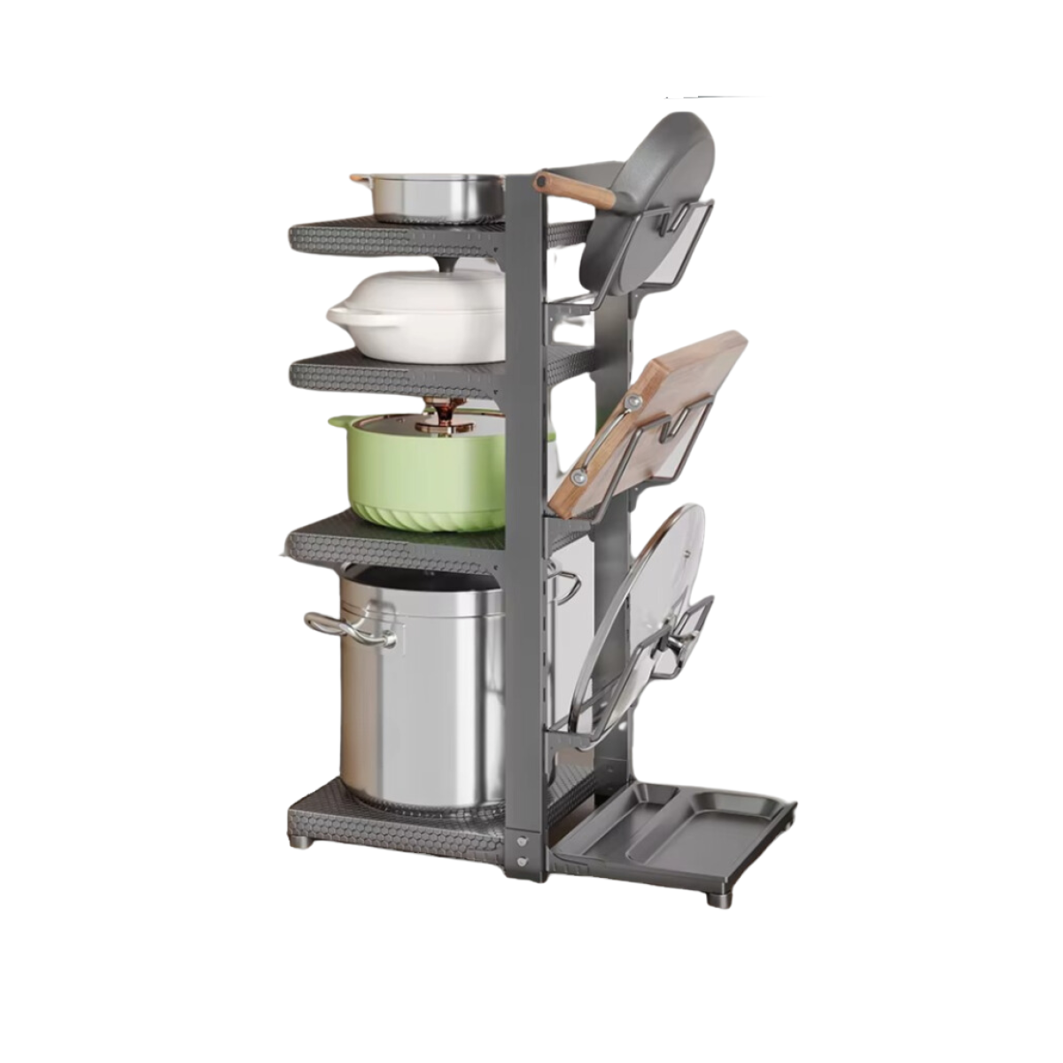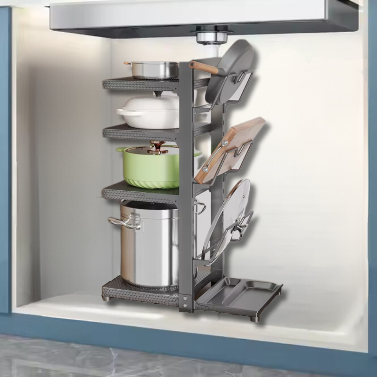 Полицю виготовлено з міцної вуглецевої сталі, що забезпечує надійність і довговічність. Знімні та регульовані за висотою полиці, а також три тримачі для кришок дають змогу адаптувати виріб під каструлі та кришки різних розмірів. Вбудований лоток розміром 20 х 17 см ідеально підходить для зберігання столових приборів, допомагаючи підтримувати порядок на кухні.