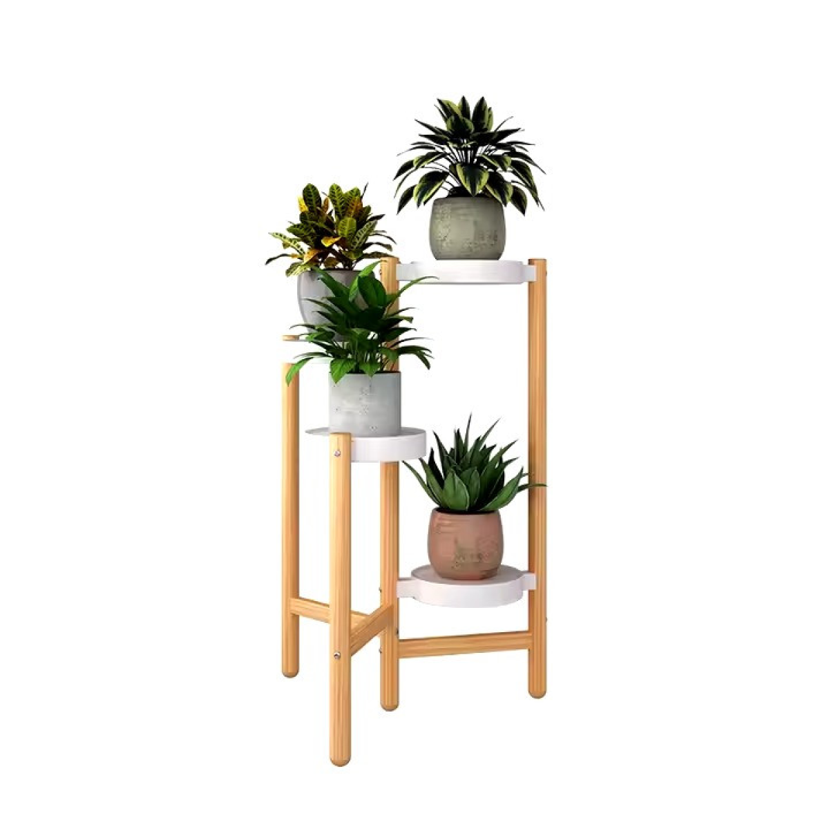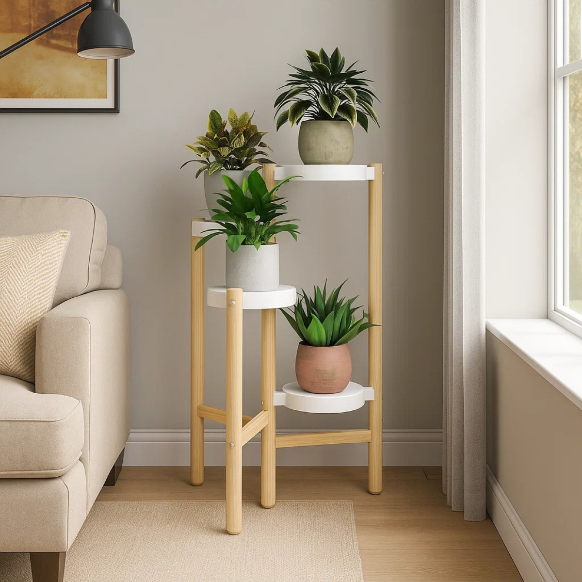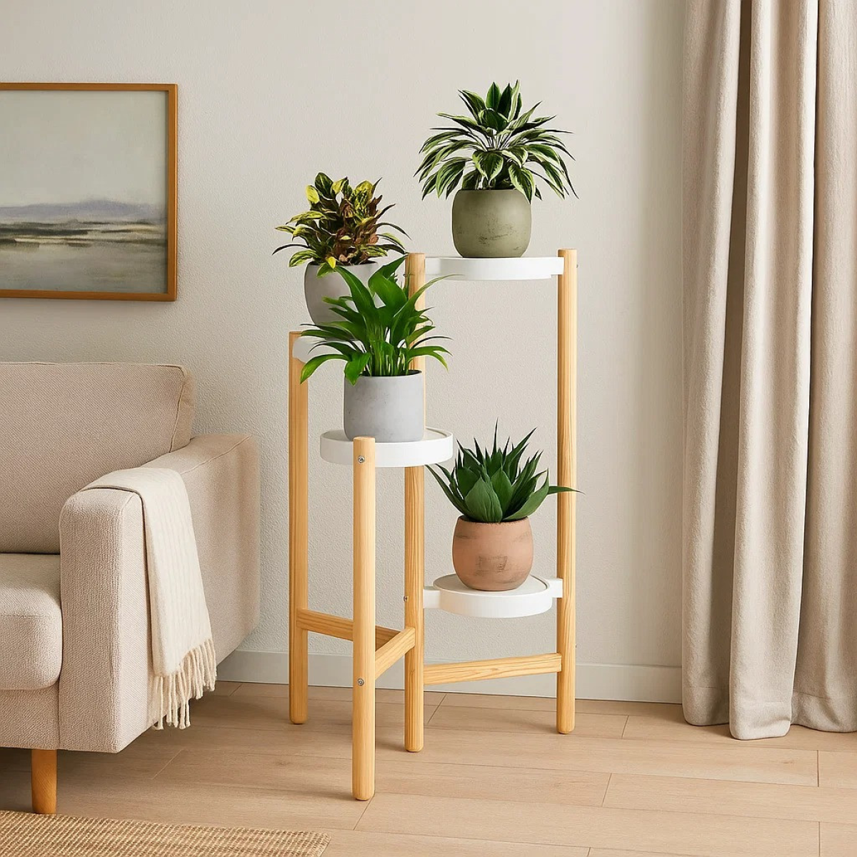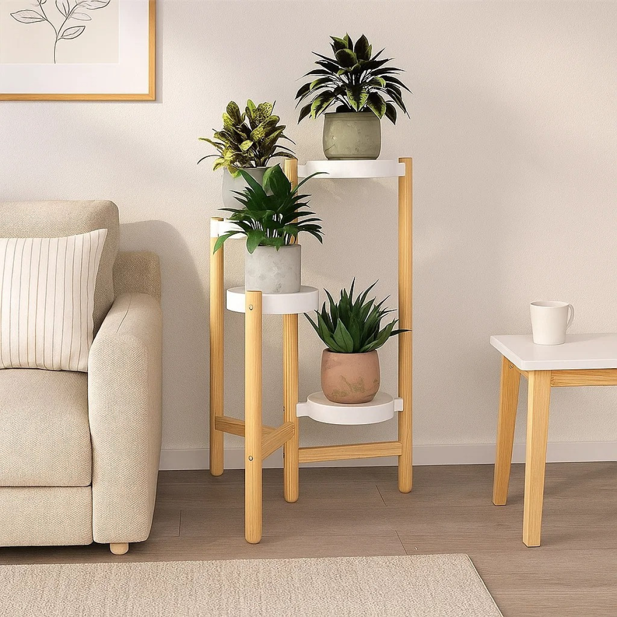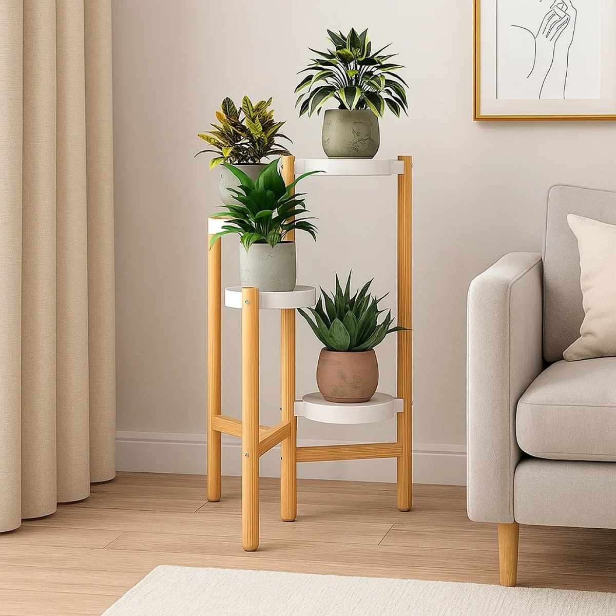 Практичний стелаж для рослин ідеально підходить для організації простору і прикраси інтер“єру. Завдяки компактним розмірам і висоті в 78 см, він зручний для розміщення горщиків з квітами, які створять зелену зону в будь-якому приміщенні. Його сучасний дизайн у кольорі під натуральне дерево з пластиковими білими тримачами гармонійно впишеться в будь-який стиль.