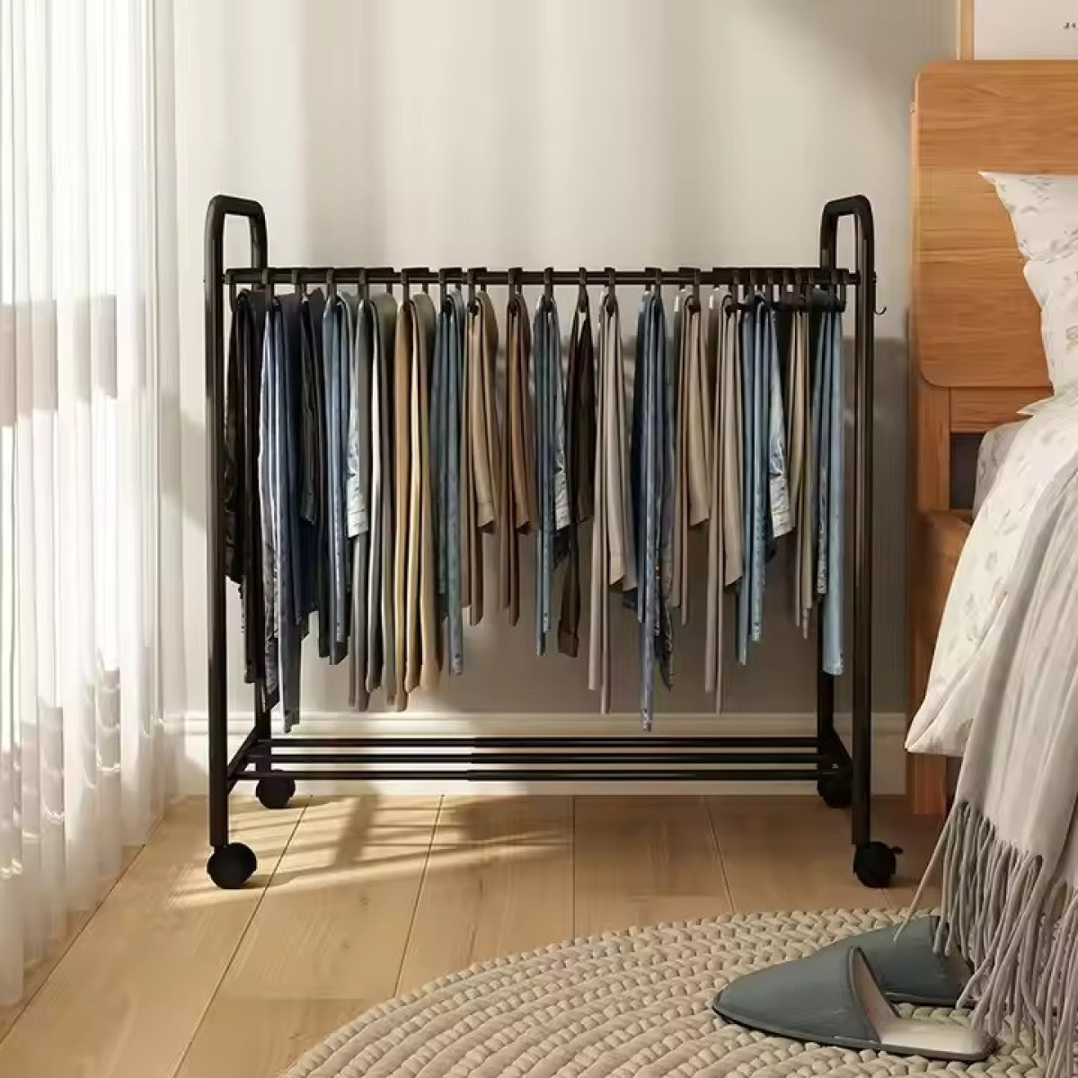 На вішалці передбачені пластикові колеса з функцією пересування, що робить її зручною для переміщення. У комплекті ви знайдете 22 пластикових тремпеля, спеціально розроблених для штанів і штанів, які допоможуть зберегти форму одягу без заломів. Нижня полиця додає додатковий простір для зберігання взуття, забезпечуючи функціональне використання вертикального простору.