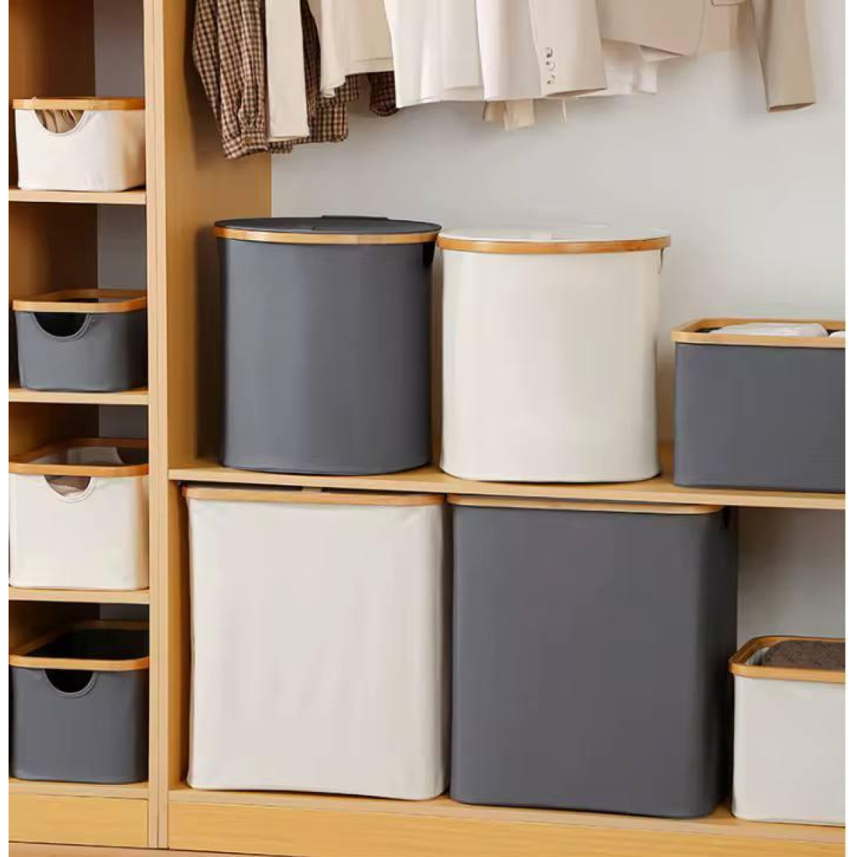 Кошик для білизни складний з бамбуковими ручками і кришкою, білий