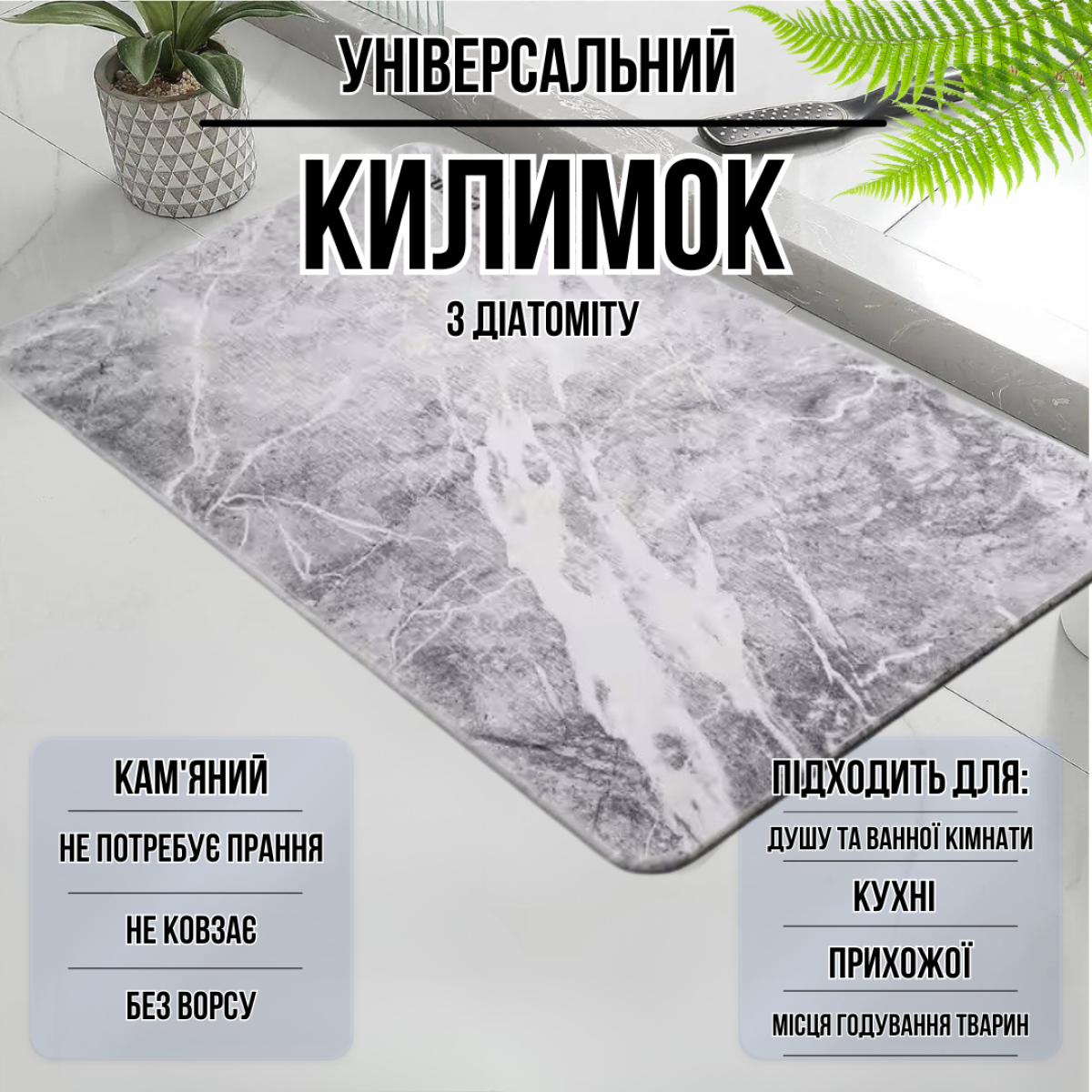 Килимок із діатоміту кольору світло-сірого граніту розміром 60х39 см - це стильний і практичний елемент для облаштування ванної кімнати, кухні, передпокою або зони годування домашніх тварин. Діатоміт, природний осадовий мінерал, відомий своїми унікальними вологопоглинаючими та антибактеріальними властивостями, що робить килимок безпечним і зручним у використанні.