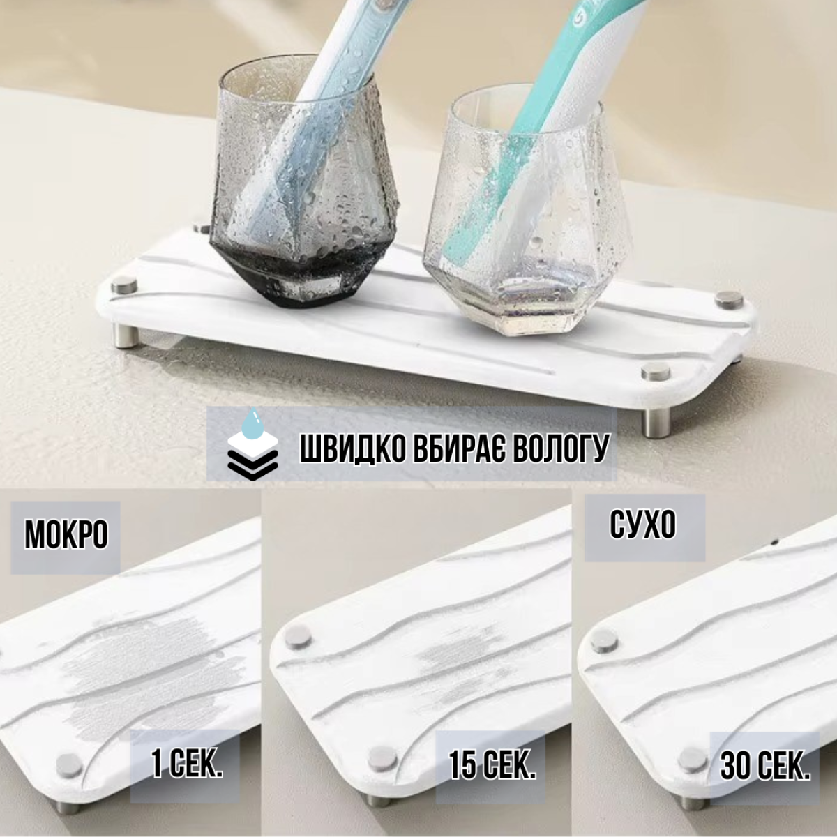 Природний матеріал для вашого комфорту Ця білосніжна підставка з діатоміту стане стильним і функціональним доповненням до вашого будинку. Діатоміт - це натуральний мінерал, що має високу здатність поглинати вологу всього за 30 секунд, запобігаючи появі цвілі та вогкості. Завдяки компактним розмірам (10х20 см) вона ідеально підходить для будь-яких поверхонь, чи то раковина у ванній кімнаті, чи то кухня, чи то тумба біля ліжка. Елегантний дизайн і універсальність Підставка оснащена міцними алюмінієвими ніжками з гумовими протекторами, що гарантує стійкість навіть на слизьких поверхнях. Її білий колір і мінімалістичний дизайн додадуть витонченості вашому інтер“єру. Використовуйте її для зберігання мила, губок, аксесуарів у ванній, на кухні, у вітальні або спальні - функціональність цієї підставки дійсно універсальна. Особливості: Матеріал діатоміт: швидко вбирає вологу, запобігає вогкості та цвілі. Міцні алюмінієві ніжки: надійність і довговічність, із захисними гумовими протекторами. Компактні розміри: 10х20 см, зручність для будь-яких приміщень. Елегантний білий колір: стильний акцент у будь-якому інтер“єрі.