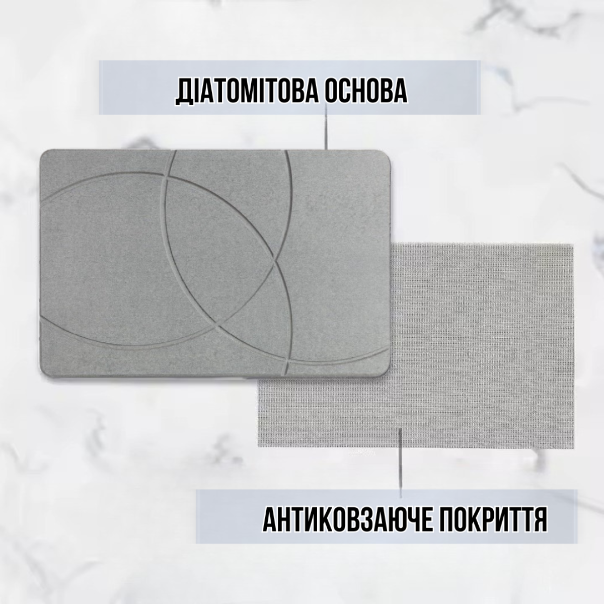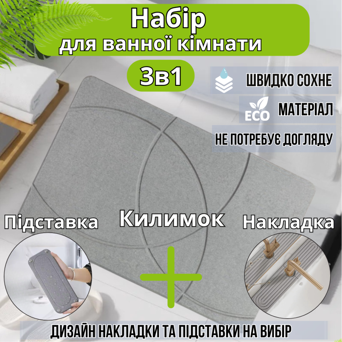 Функціональний комплект для ванної кімнати та душу Створіть затишок і комфорт у ванній кімнаті з практичним і стильним набором, виконаним у світло-сірому кольорі. Цей комплект не тільки прикрасить інтер’єр, але й забезпечить зручність у повсякденному використанні. Що входить у комплект? • Килимок для ніг (60×39 см, товщина 9 мм) – м“який і приємний на дотик, швидко вбирає вологу, залишаючи поверхню сухою. • Килимок-накладка для раковини (60×10 см) – зручне місце для зберігання мила та аксесуарів. • Підставка для склянок (20×10 см) – універсальний елемент для організації простору. Чому варто обрати цей комплект? Виготовлений із діатоміту – натурального мінералу з високою пористістю, він має чудові вологоабсорбуючі властивості. Матеріал швидко висихає, запобігає появі плісняви та не потребує складного догляду. Завдяки своїй екологічності, діатоміт безпечний для здоров’я та довкілля. Переваги: • Швидко висихає • Не пліснявіє • Легко очищується • Екологічно безпечний Дизайн накладки та підставки на вибір!