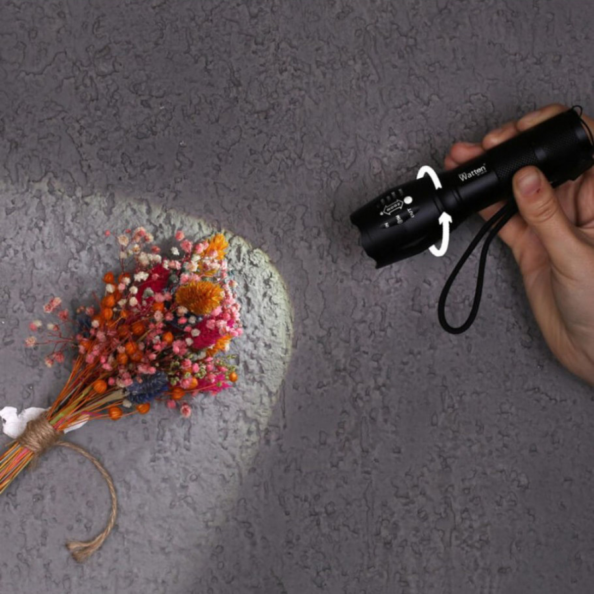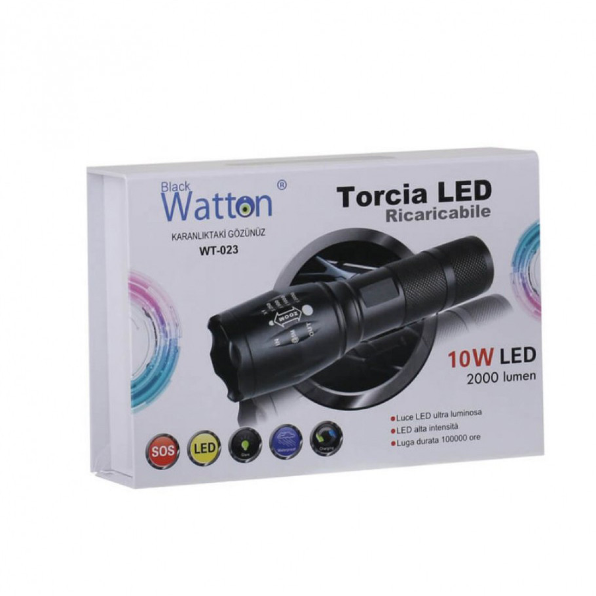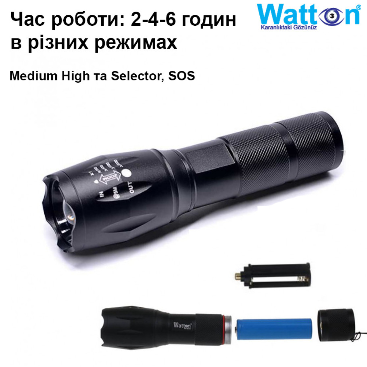 WT-023 пропонує 4 різні режими освітлення, а також 2 варіанти освітлення. Все, що вам потрібно зробити, це натиснути кнопку перемикання. Завдяки функції масштабування WT-023 має переваги для полювання та стане вашим незамінним помічником. Збільште масштаб, щоб збільшити освітлення. Зменшіть масштаб, щоб зібрати світло та отримати максимальну яскравість. Ми представляємо його вам із високотехнологічним дизайном та захистом від дощу (вражаюча продуктивність серед ліхтариків), міцним алюмінієвим корпусом та удароміцною конструкцією. Світлодіодне світло 2000 люмен досягає майже 2 км. Повністю масштабований від широкого до вузького.