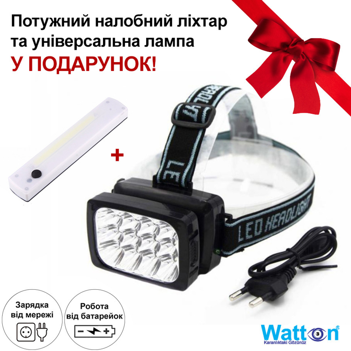 Потужний акумуляторний ліхтар-прожектор з 12 світлодіодами та лампа на батарейках У подарунок!