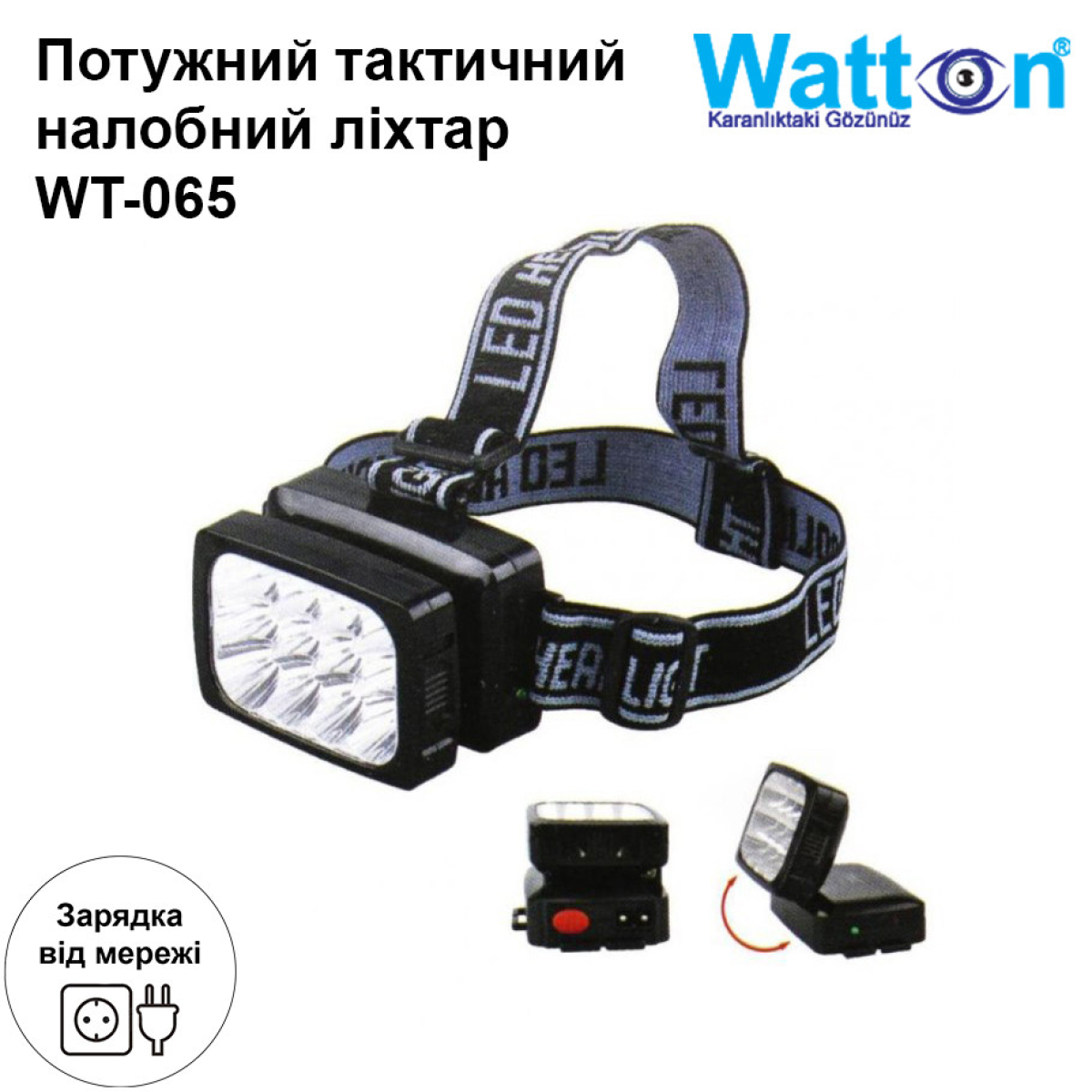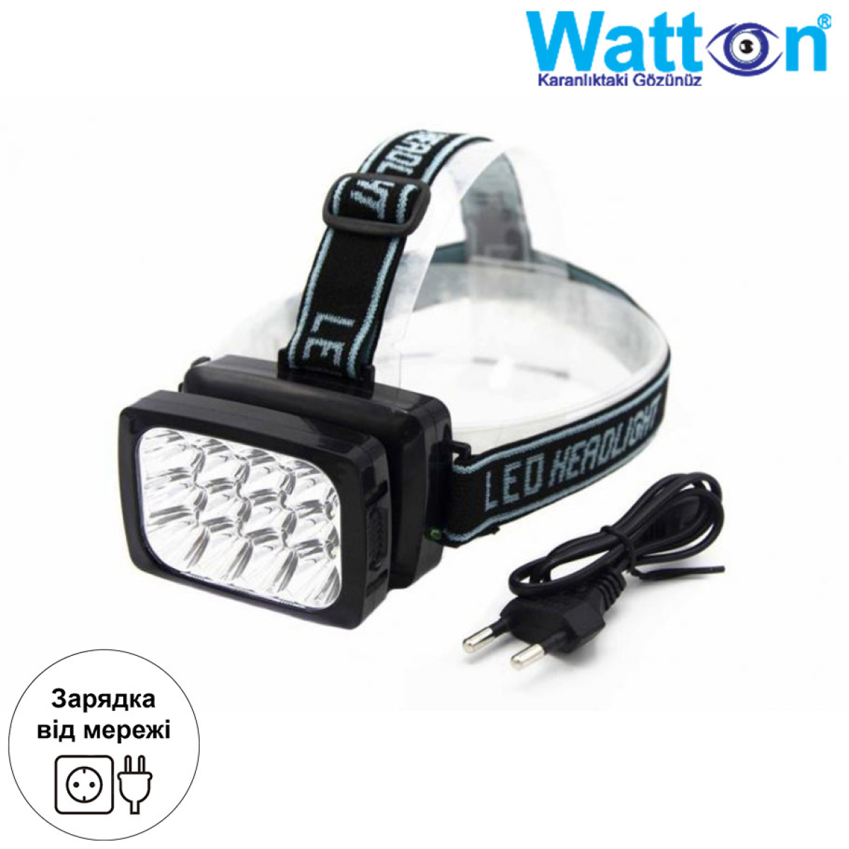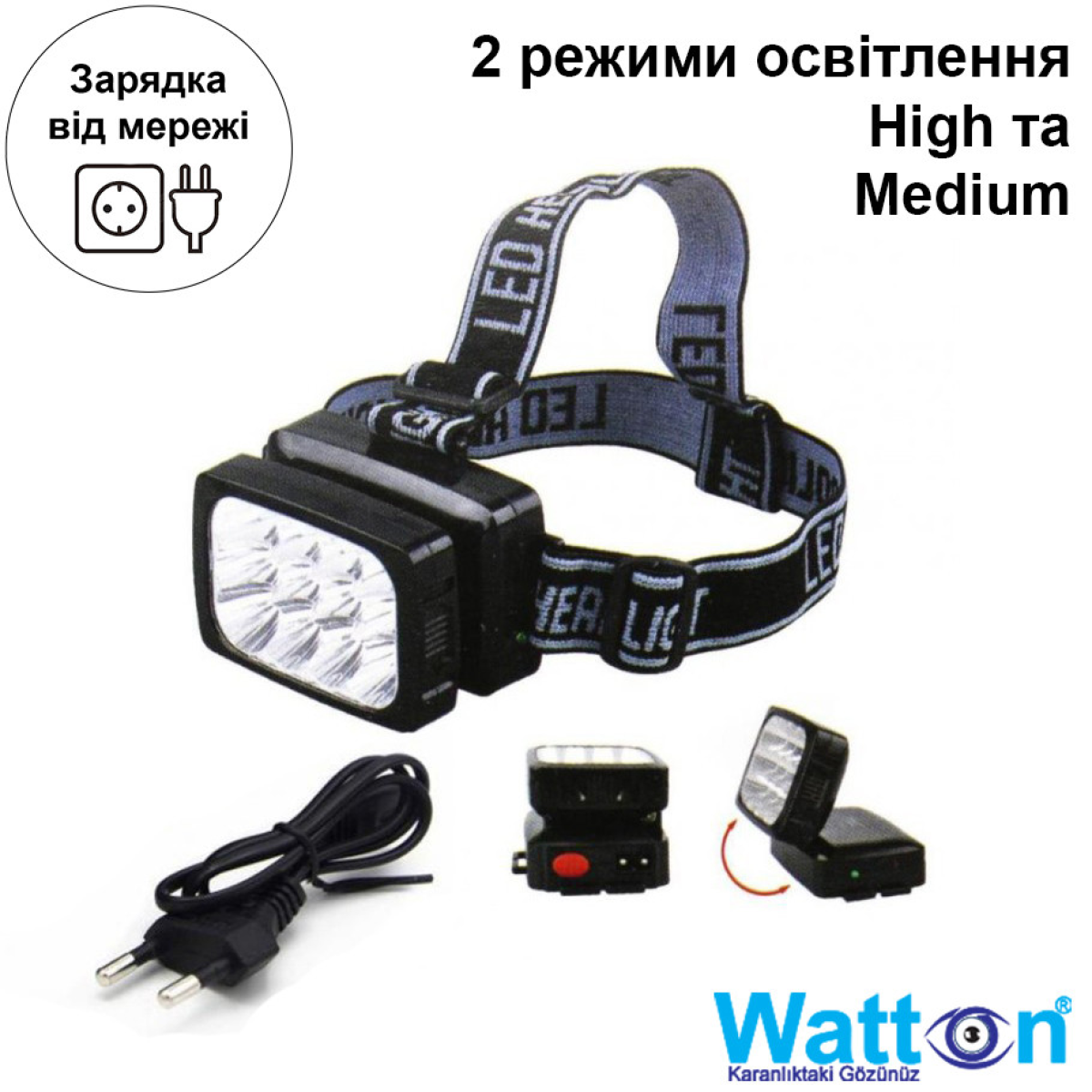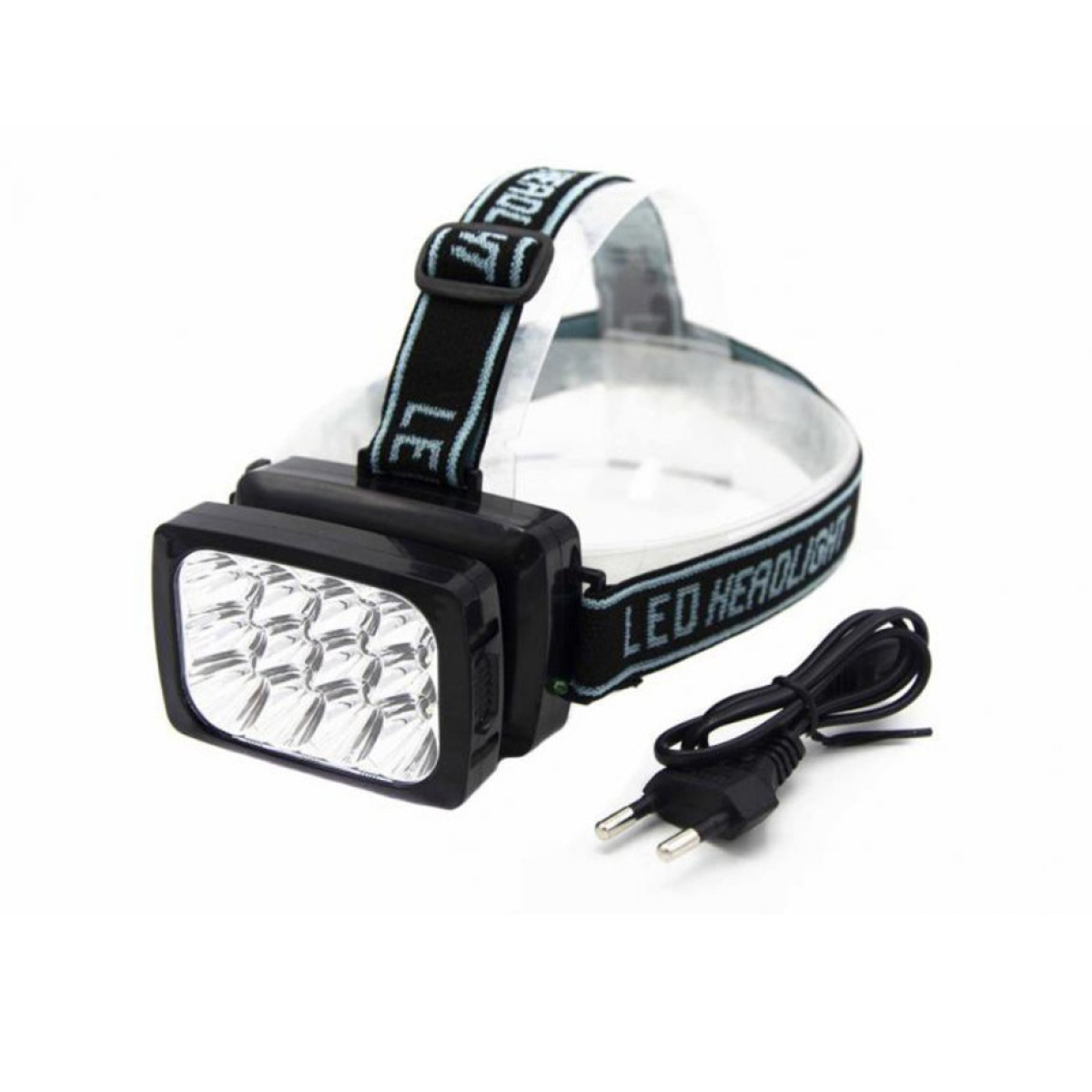 Технічні характеристики: Розміри: 9 см х 5 см х 7,5 см. Особливості освітлення: 12 шт., Яскраві світлодіоди. Світлий колір: білий. Час роботи: 5 – 15 годин. Матеріал: жорсткий пластик. Використання: 2 режими освітлення High-Medium. Особливості використання: легка фіксація на голові та гнучка гумка. Акумуляторна батарея 220/240 Вт, 50/60 Гц (вбудований акумулятор) Комплектація: ліхтар та зарядний кабель. Термін служби лампи: 100000 годин. Місце використання: для полювання, рибалки, для військових та армії, для дому та дачі. Існує функція енергозбереження. Важливі попередження: не спрямовувати на очі! Перед першим використанням заряджайте протягом 8 годин.