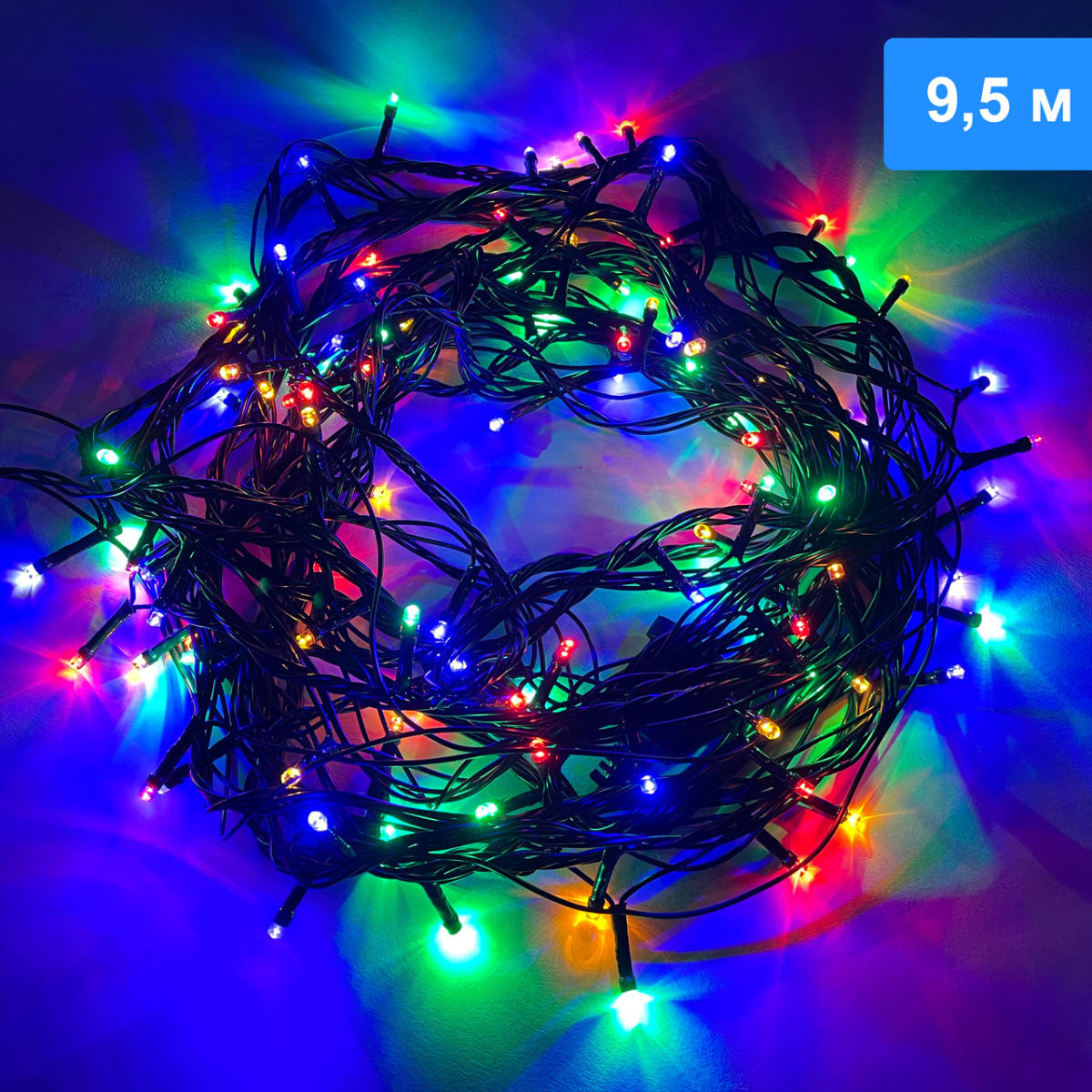Новорічна гірлянда з яскравими різнокольоровими лампочками 9,5 метрів та чорним шнуром з вилкою для розетки
