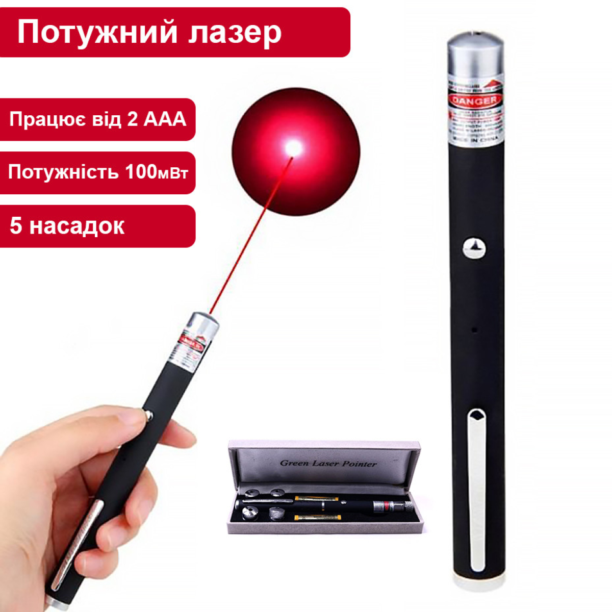 Лазер червоного кольору на батареях BIGEM BM-522 100 мВт лазерна указка з насадками