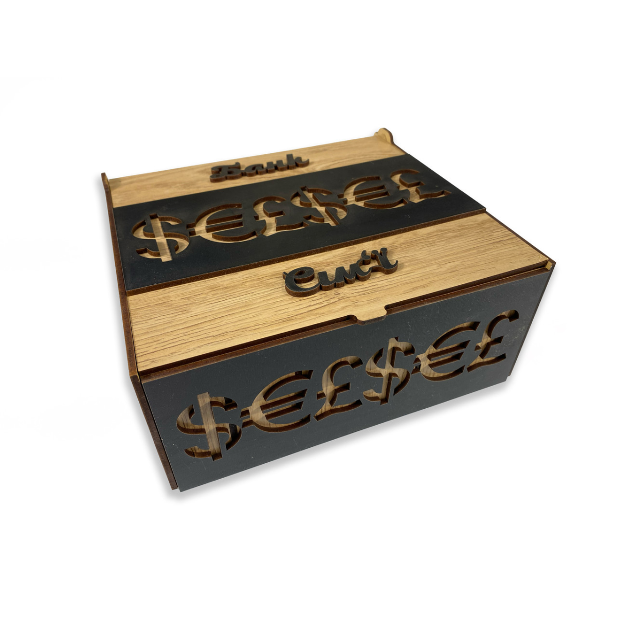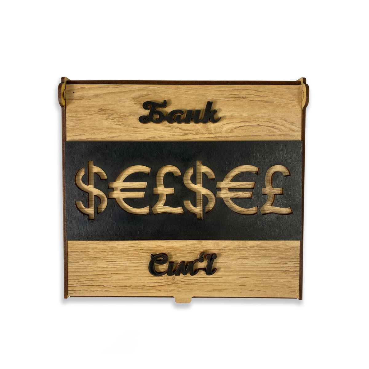 Коробка-органайзер для грошей БАНК СІМ“Ї з натурального дерева з різьбленням та перфорацією, скарбничка 20x18,5x8,5 см