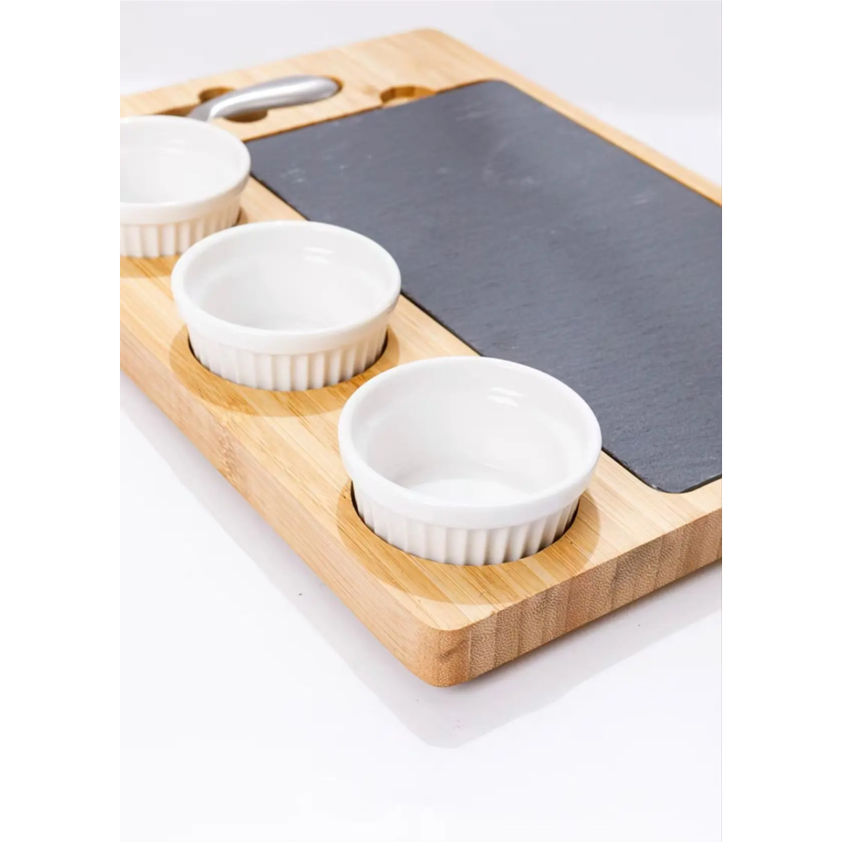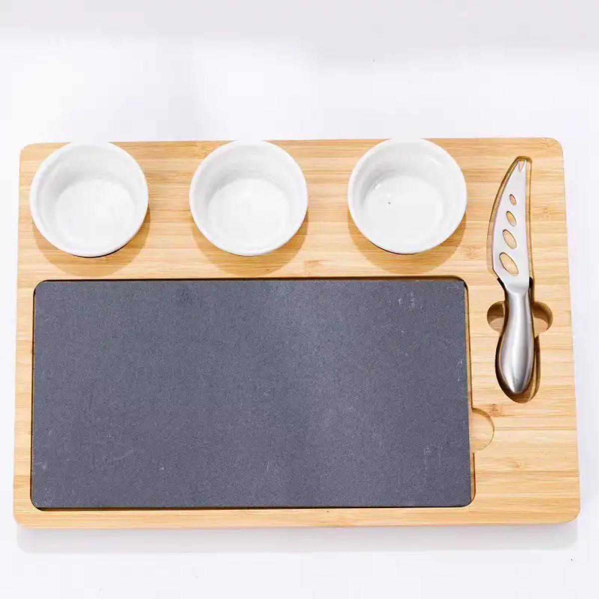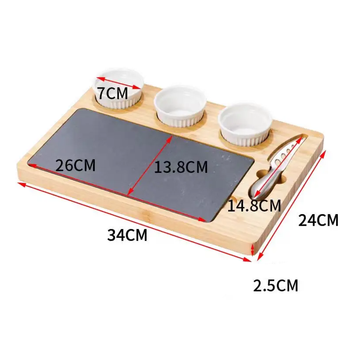 Дошка для сиру і закусок бамбукова з ножем і соусниками, менажниця дерев“яна для нарізки 34×24×2.5 см
