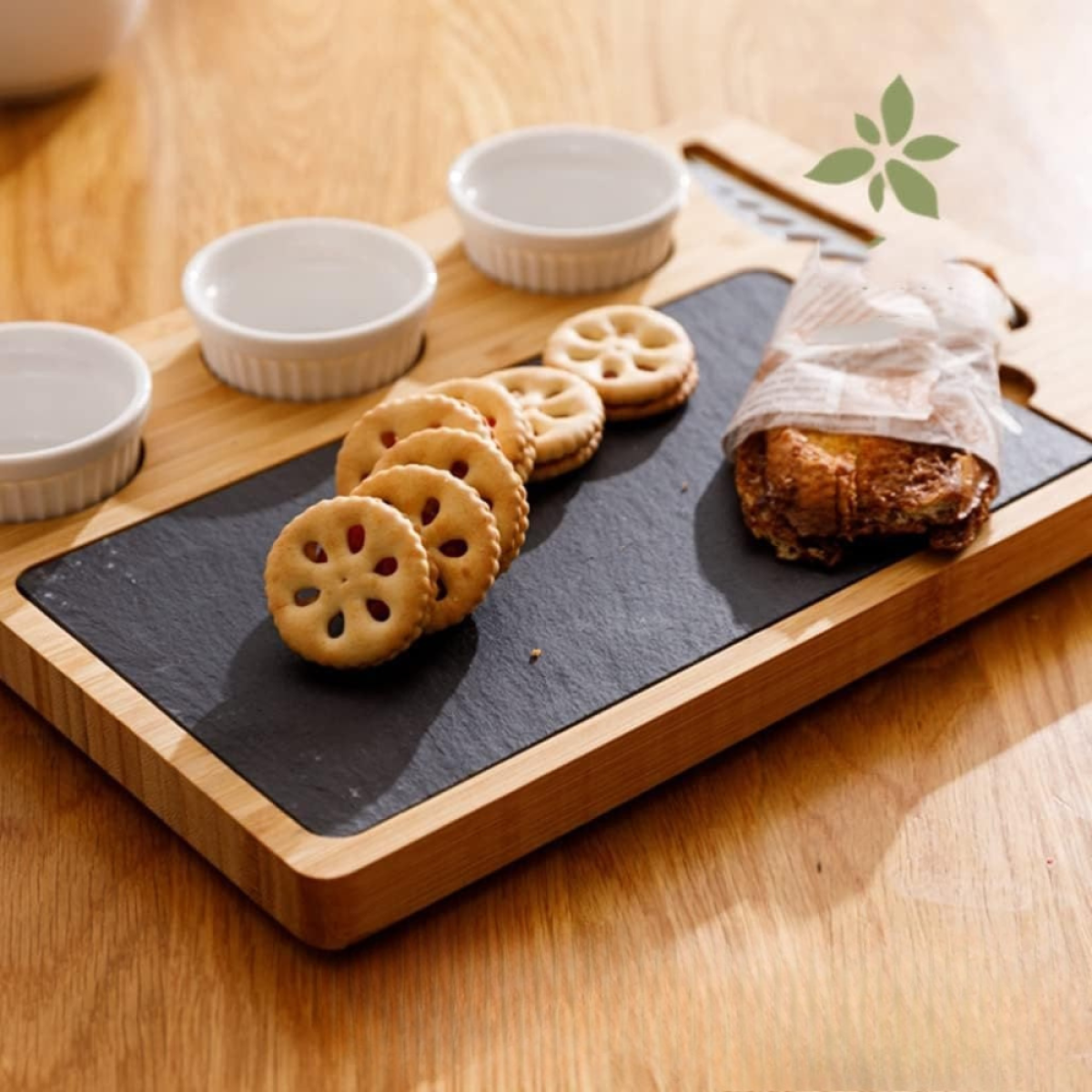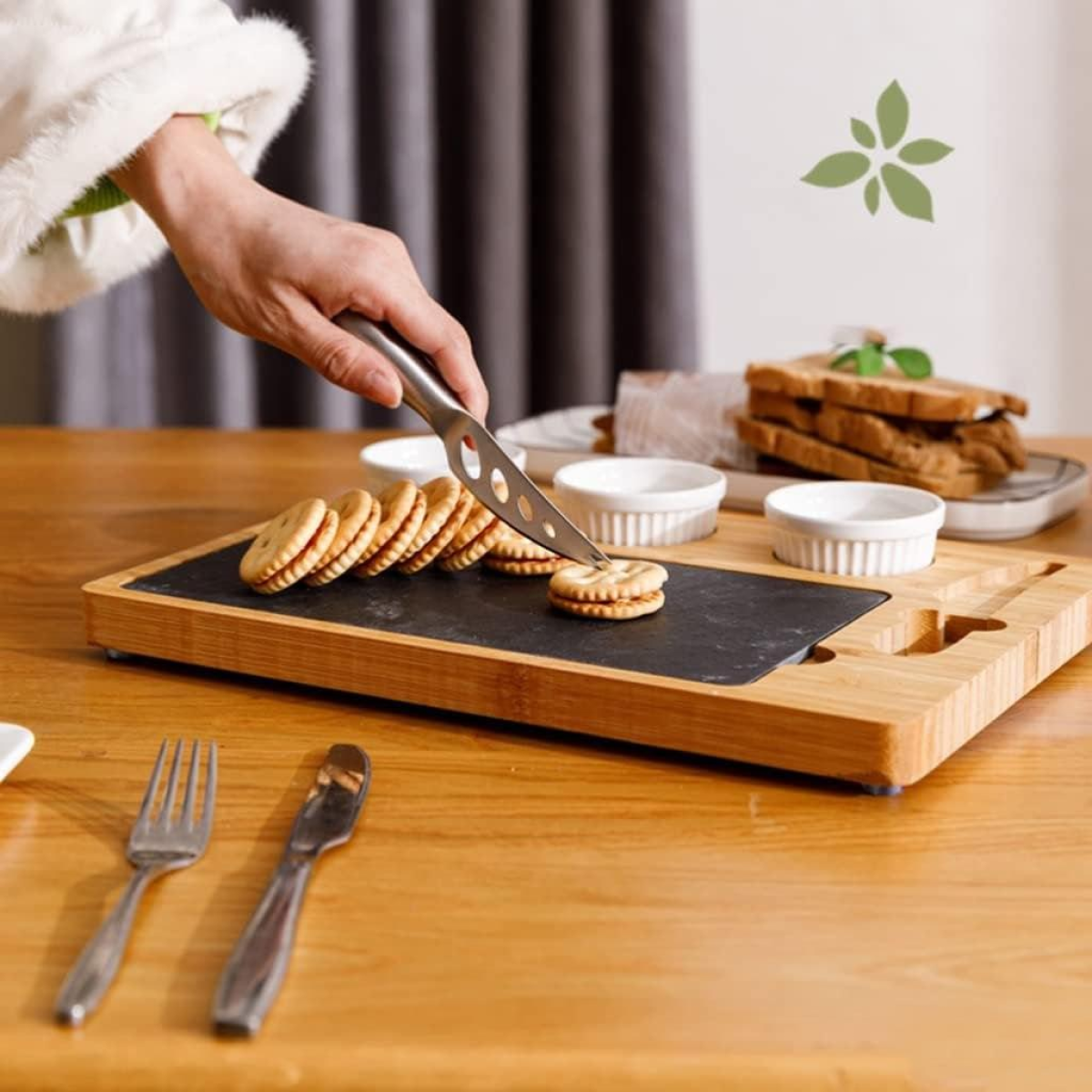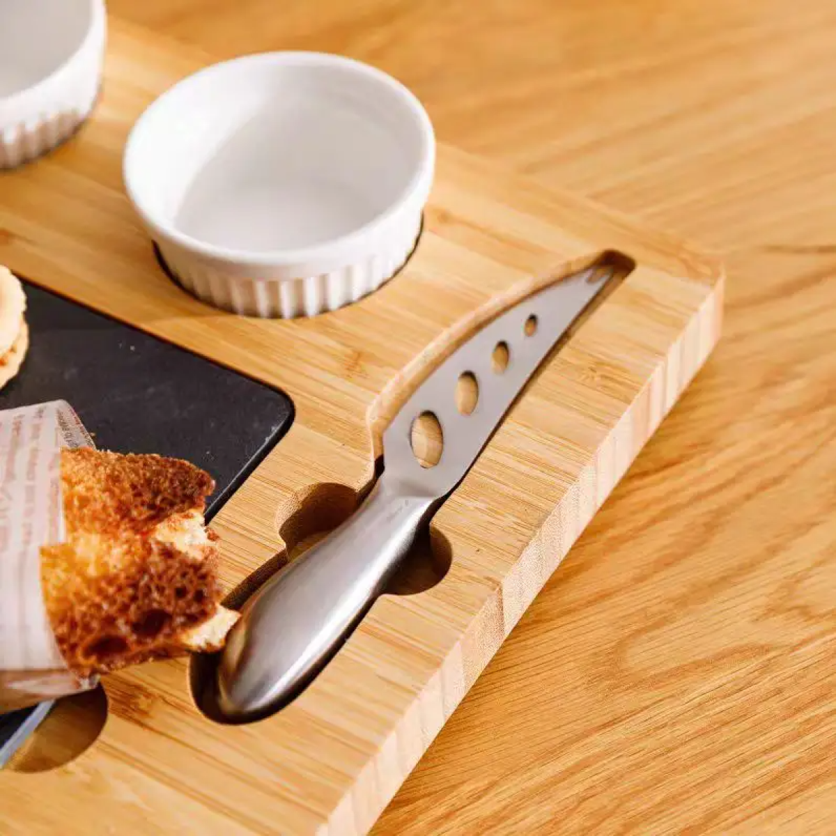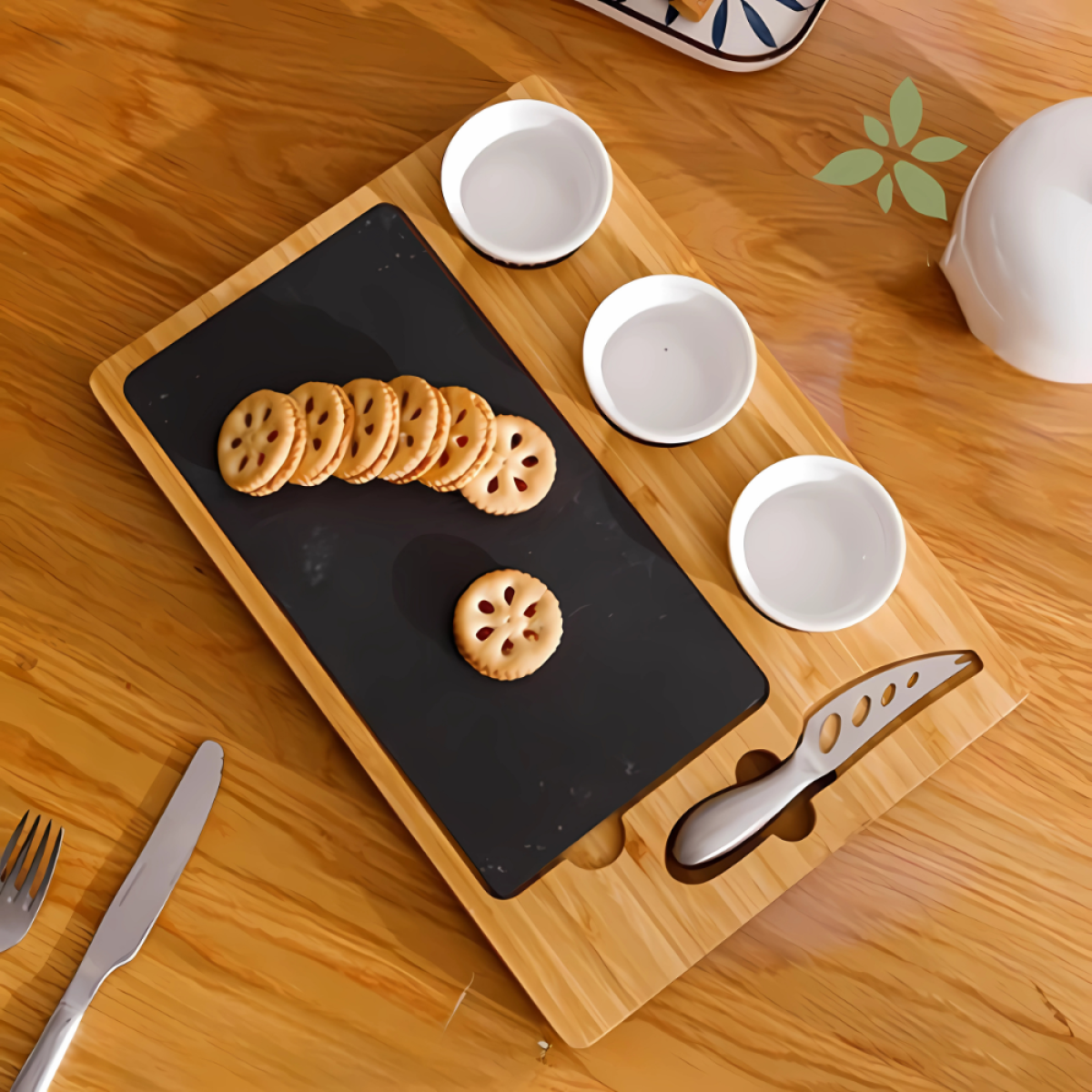 Дошка для сиру і закусок бамбукова з ножем і соусниками, менажниця дерев“яна для нарізки 34×24×2.5 см