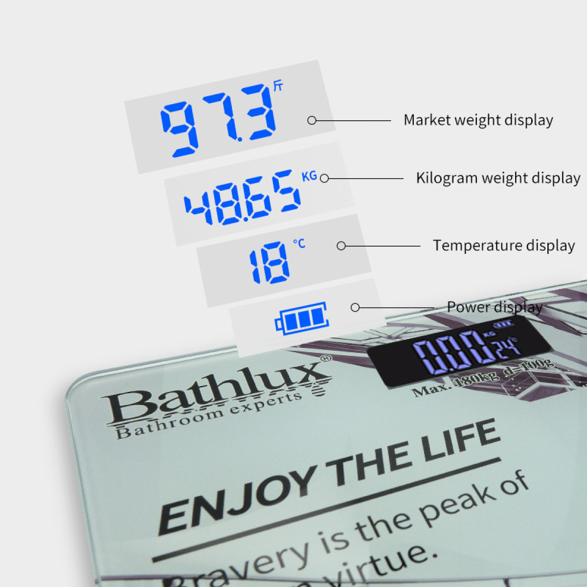Суперточные ваги Bathlux Classic виконані із загартованого скла в ніжному спокійному колірному рішенні зі стильним дизайном. Завдяки широкій платформі їх зручно і приємно використовувати, а функція автоматичного включення приведе їх у режим роботи, як тільки ви на них встанете. Великий дисплей розміром 28x28 см чітко і точно відображає вагу, так що вам не доведеться нагинатися, щоб розгледіти цифри. Пристрій визначає вага до 180 кг з точністю до 100 г. Функція автоматичного відключення дозволить зберегти заряд батареї надовго, ваги зручно зберігати в будь-якому зручному місці.