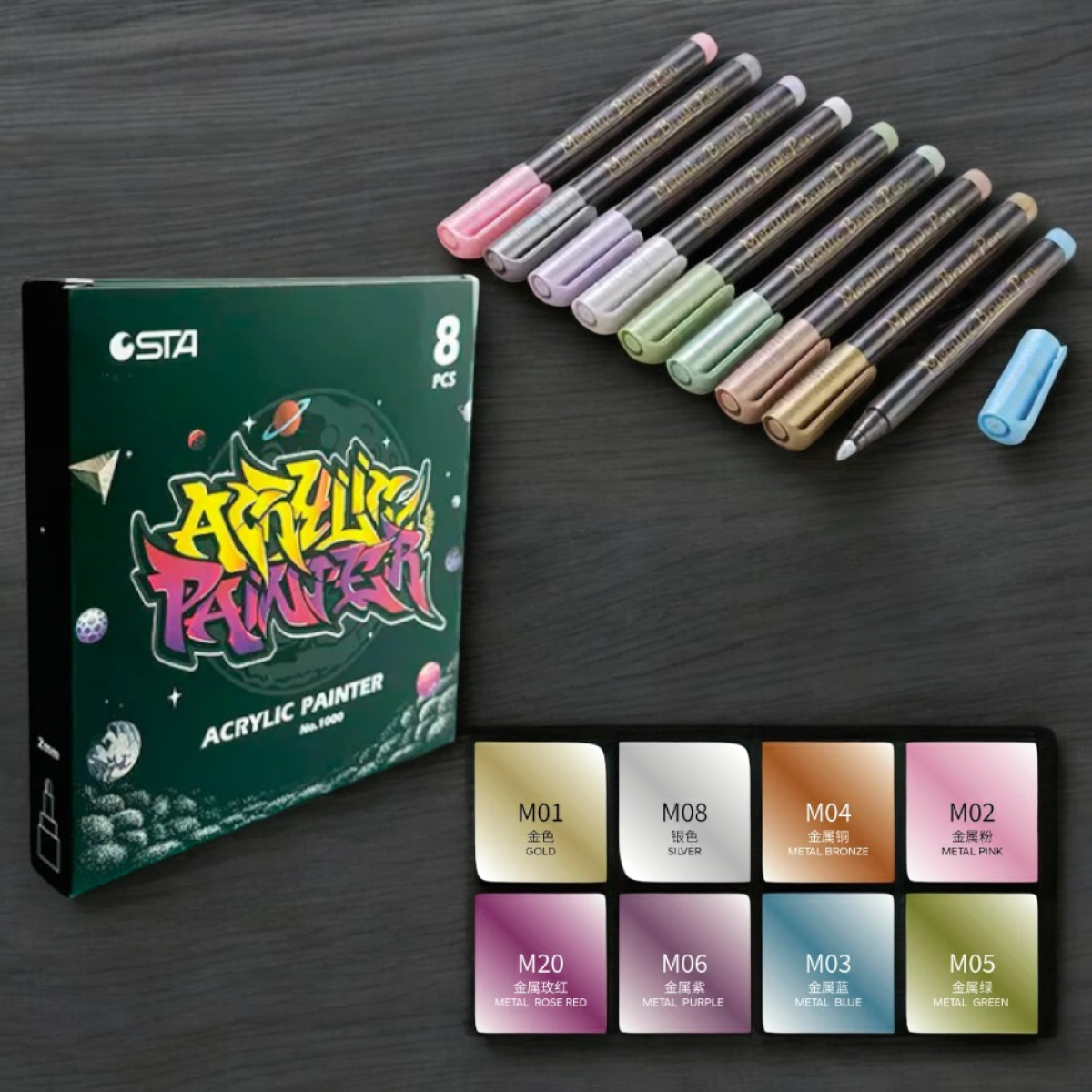 Маркери акрилові STA для малювання, преміум якість, набір 8 Metallic кольорів, універсальні для скла, дерева, ткани та кераміки