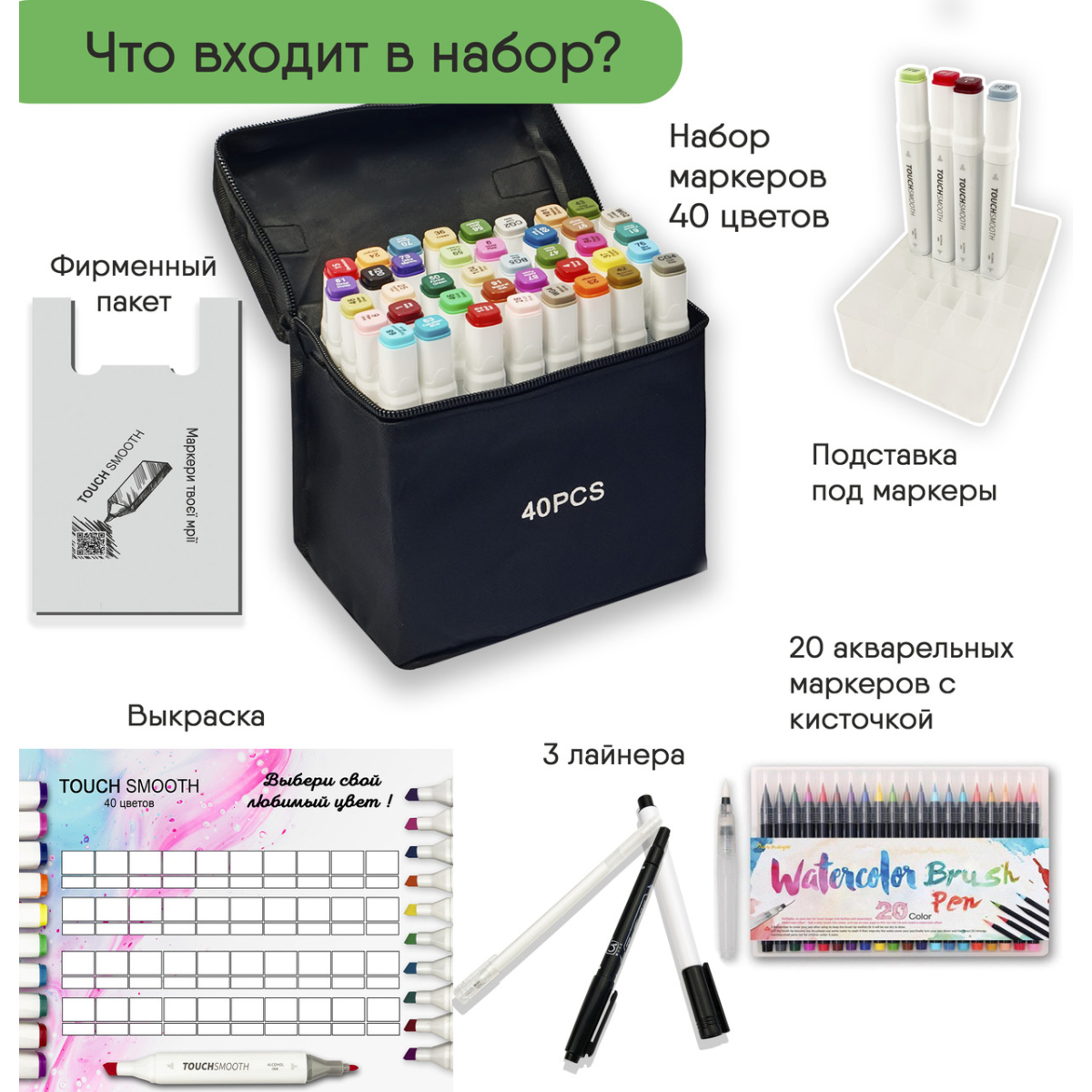 Маркери Тач смус Арт - кращий варіант представлений на українському ринку! Сертифікований продукт, повний комплект. Купуючи наші маркери Ви отримуєте не тільки самі високоякісні маркери, з найбільшим наповненням чорнила, але і так само : Підставку під кожен маркер Вимальовку для кожного кольору Вашого Набору Три лайнера , два чорного кольору і блікову ручку Брендований пакет, для того що б маркери завжди були з Вами І солодкий бонус від нашого магазину, для натхнення ☺️ Сертифіковані маркери найкращої якості, з повним комплектом ! СПЕЦІАЛЬНА ПРОПОЗИЦІЯ! Ви купуєте Набір двосторонніх маркерів Touch Smooth для скетчинга на спиртовій основі 40 шт і разом з ними отримуєте Набір акварельних маркерів Water Color Brush маркер - пензлик 20 кольорів Набір двосторонніх маркерів Touch Smooth для скетчинга на спиртовій основі 40 штук У наборі 40 маркерів різних кольорів. Корпус пластиковий, гладкий. Ковпачки щільно закриваються. Кожен маркер має два наконечника різної форми для різного типу робіт. Загострений наконечник для тонких ліній і контурів. Плоский наконечник зі скошеним краєм для широких штрихів. Для зручності розпізнавання типу пера кінці маркерів пофарбовані різними кольорами. Кожен колір має свій цифровий код, який нанесений на ковпачок маркера. Чорнило на спиртовій основі добре вбираються в папір, тому рекомендується використовувати щільні листи або картон. Кольори добре змішуються між собою, плавний перехід відтінків. Хороший вибір відтінків для шкіри людини Довжина маркера 16,8 см. Корпус маркерів і чорнило виготовлені з сертифікованих матеріалів і повністю безпечні як для дітей, так і дорослих. Набір акварельних маркерів Water Color Brush маркер - пензлик 20 кольорів В набір для малювання входять маркери з акварельною фарбою (палітра з 20 відтінків) + пензлик з порожнім баком для води. Чорнило в маркерах - це акварель високої якості, що дає можливість вільно працювати в акварельних або маркерних техніках. Фарба розмивається м“яко, без різких переходів. Чорнило на водній основі нагадують насичені акварельні фарби, тому кольори можна легко змішувати один з одним і ретушувати. Імітують акварель, чисті і зручні у використанні, можна легко застосовувати на відкритому повітрі і швидко створити робочу майстерню. Друга особливість цих чарівних маркерів - це пензлик. Він м“яко і плавно ковзає по папері, лінії немов самі вибудовуються так, як потрібно. Пензлик середній за розміром і стійкий до вигинів і “розпушування“. Маркери відрізняються насиченістю й чистими кольорами в оптимальному діапазоні 20-ти найбільш популярних відтінків. Відмінно підходять для малювання в традиційній техніці, при промальовуванні деталей, розфарбовуванні, а також каліграфії і тонкі, так і товсті лінії малюються дуже легко. Також ці маркери це прекрасна ідея для подарунка для маленьких художників!